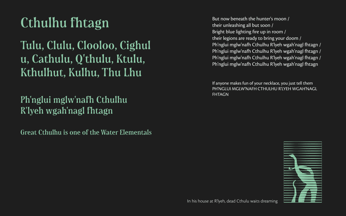 The typographic system combines two carefully selected typefaces. Soprani, a variable serif inspired by a 1920s New Zealand plaque, is used for display and headlines — its dramatically flared serifs and shimmering optical effect evoke the era in which Lovecraft wrote, while remaining unmistakably contemporary. Cronos Pro is used for body text and UI elements, bringing calligraphic warmth and legibility to smaller sizes while maintaining the period atmosphere. Together, they create a voice that whispers rather than shouts.