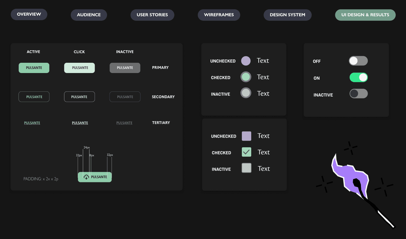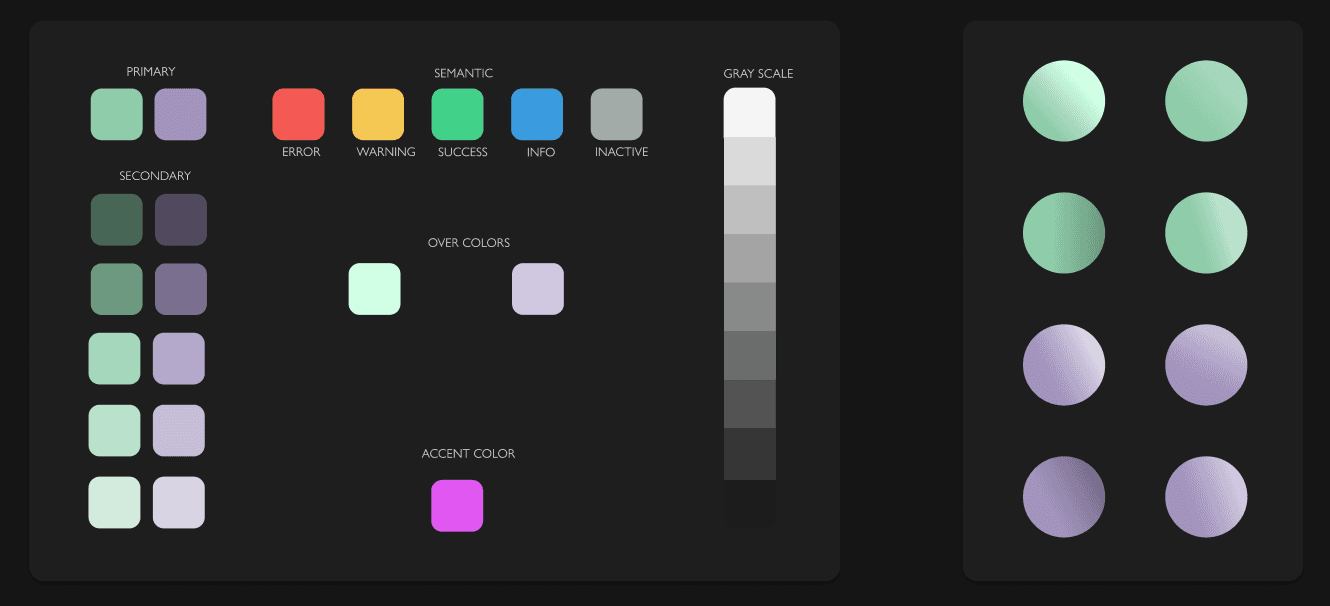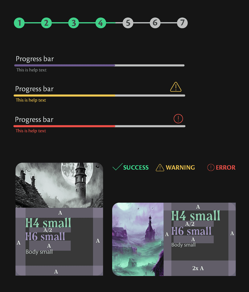 The palette is built around two dominant hues, chosen for their symbolic and emotional resonance. The first is an aristocratic purple, which evokes the ancient and elite nature of the cosmic entities that the player encounters. The second is a dangerous and murky green, inspired by the remote and threatening landscapes of Lovecraftian fiction. These primary colours expand into a full gradient system, ranging from deep secondary tones to delicate tints, alongside a complete semantic layer for error, warning, success, information and disabled states. The result is a colour system that is both narratively coherent and technically comprehensive.