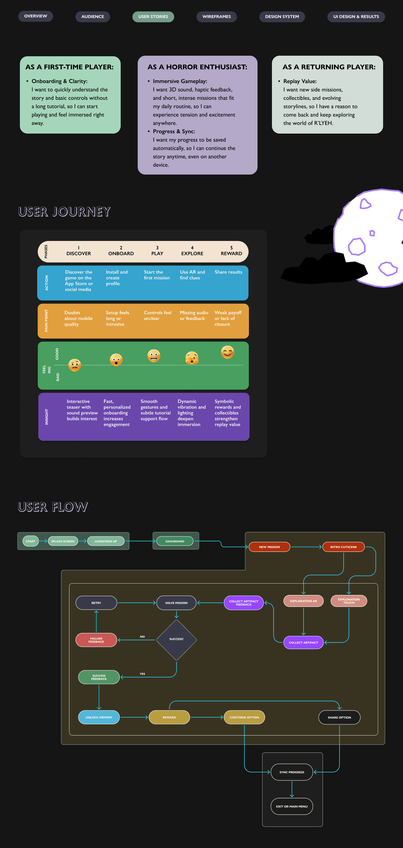 Outcome: The R'lyeh design system is a comprehensive, documented visual framework covering typography, colour, grids, spacing, icons, buttons, selections, cards and wireframes. It is designed to sustain a narrative world throughout the entire mobile experience. It demonstrates that a UI system can be as much an act of world-building as it is an act of design.