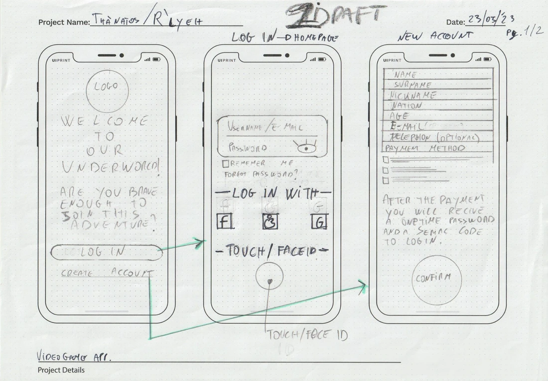 The interface was developed from hand-sketched wireframes to full digital flows. The onboarding sequence, account creation, campaign selection, tutorial and core gameplay screens were mapped in complete UI wireframes before any visual styling was applied, ensuring the navigation logic was sound before the atmosphere was layered on top. The player moves between two temporal environments — 2024 and the mid-20th century — and the interface subtly changes style between them.